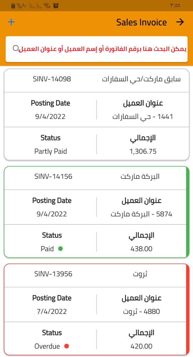 3 - البحث عن فاتورة المبيعات برقم الفاتورة أو إسم العميل أو عنوان العميل